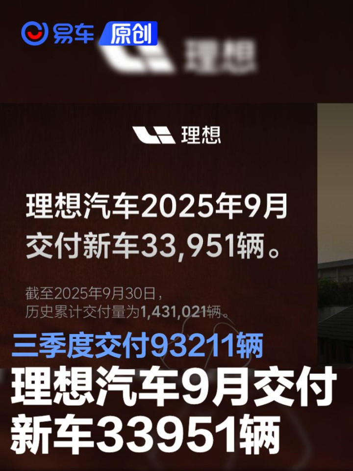 易车讯10月1日,理想汽车公布2025年9月交付数据。2025年9月,理想汽车交付新车33951辆。2025年第三季度,理想汽车交付93211辆。截至2025年9月30日,理想汽车历史累计交付量为1431021辆。
