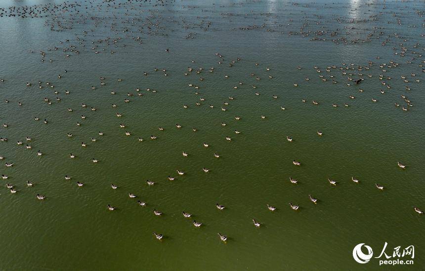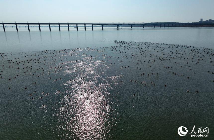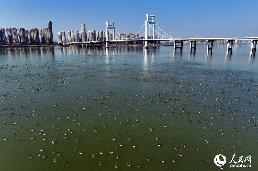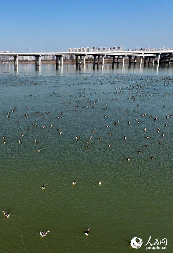 成群冬候鸟在洪州大桥水域栖息觅食,为冬日江岸增添盎然生机。人民网记者 时雨摄